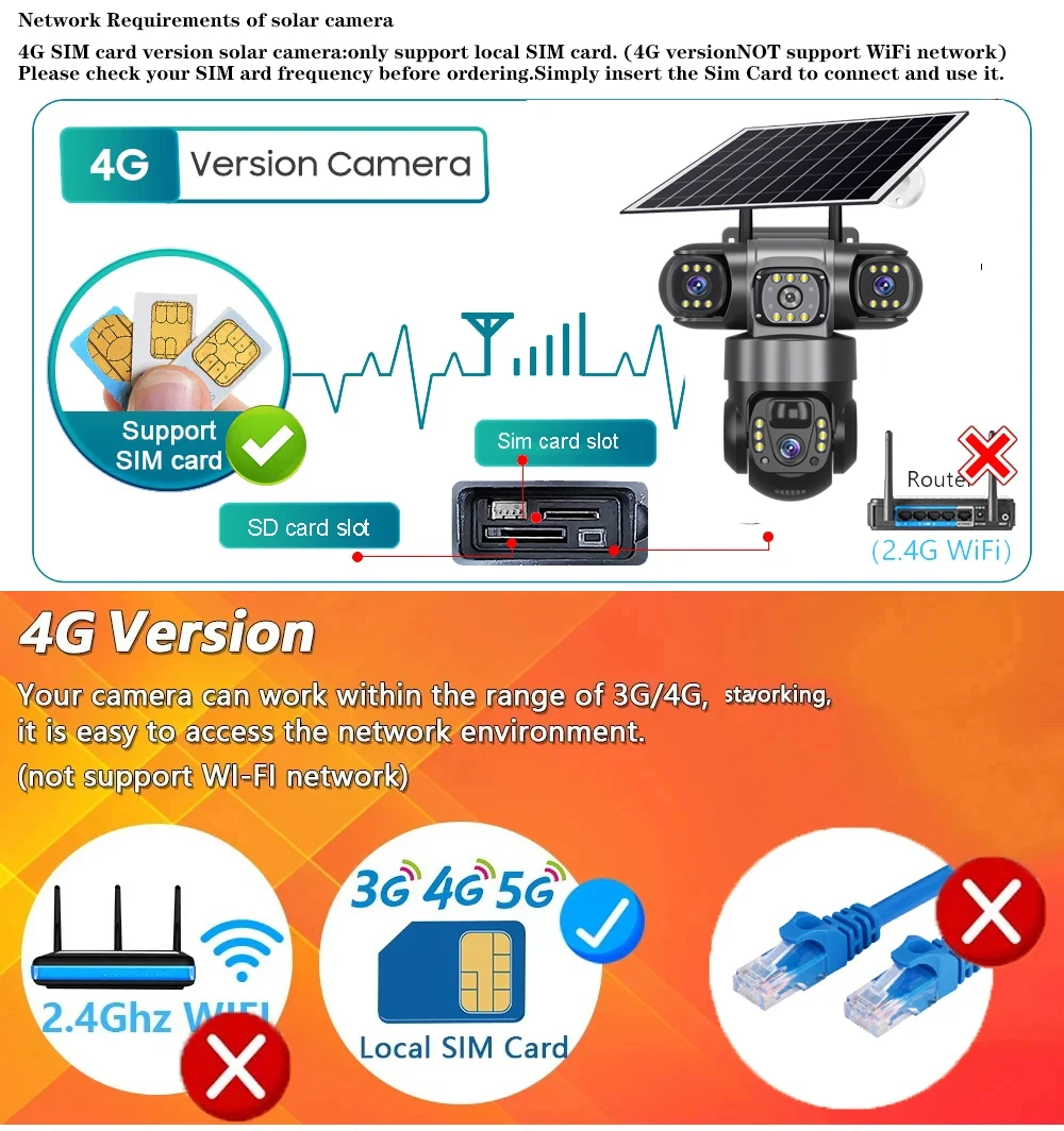 4G SIM card version solar camera:only support local SIM card.(4G versionNOT support WiFi network) Please check your SIM ard frequency before ordering.Simply insert the Sim Card to connect and use it.