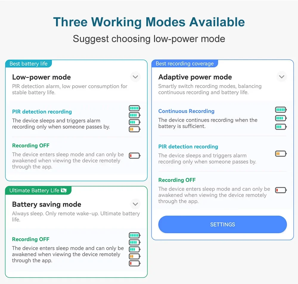 Usually, the camera is continuously recording,When the battery is low, it will automatically switch to the human body sensing alarm recording mode.That is to say, entering a sleep state, if someone appears, the camera will be awakened and the recording will be saved.