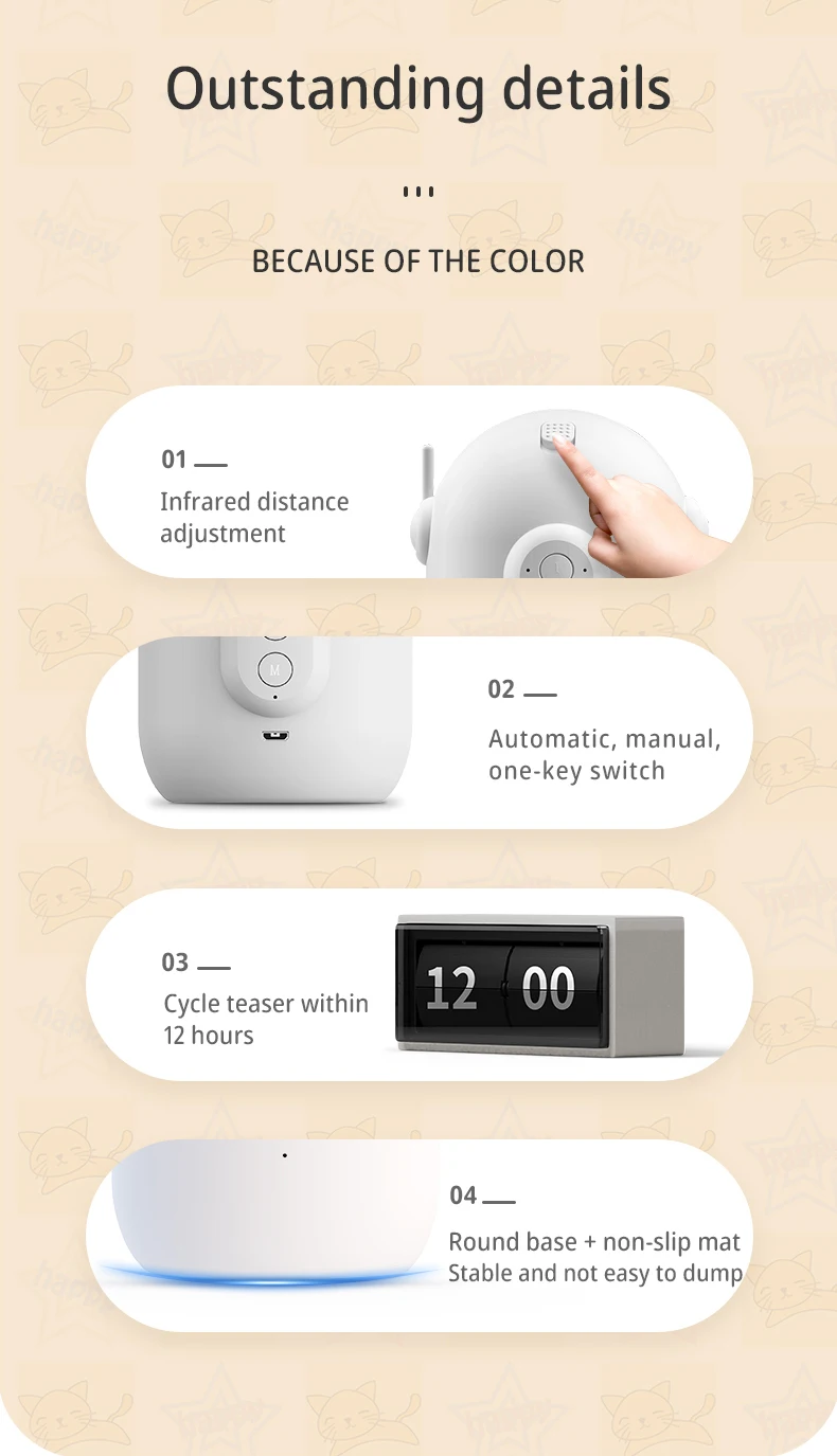 Level 1: Automatically tease pets upon startup, shuts down after 10 minutes (fast/slow mode, one-button switch)
