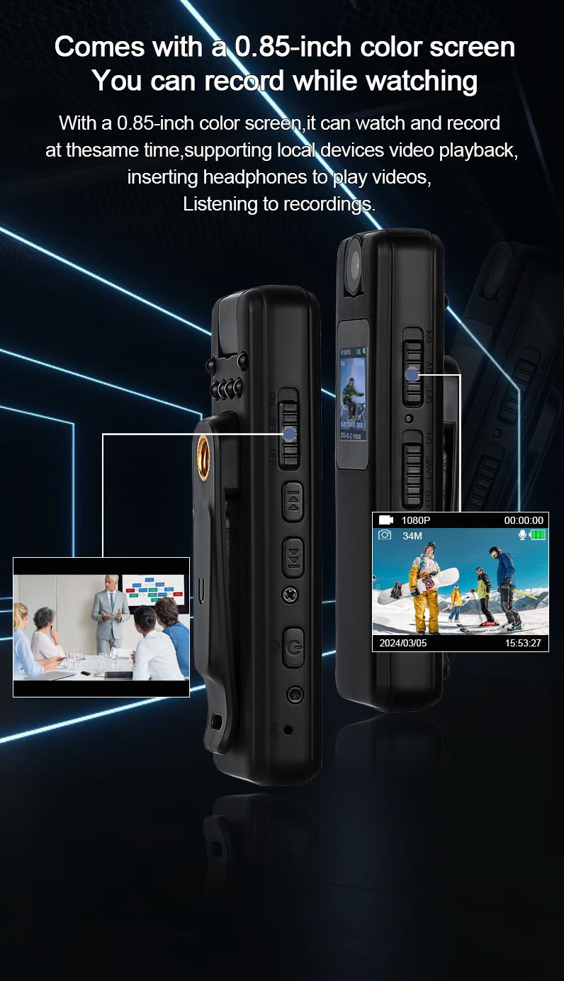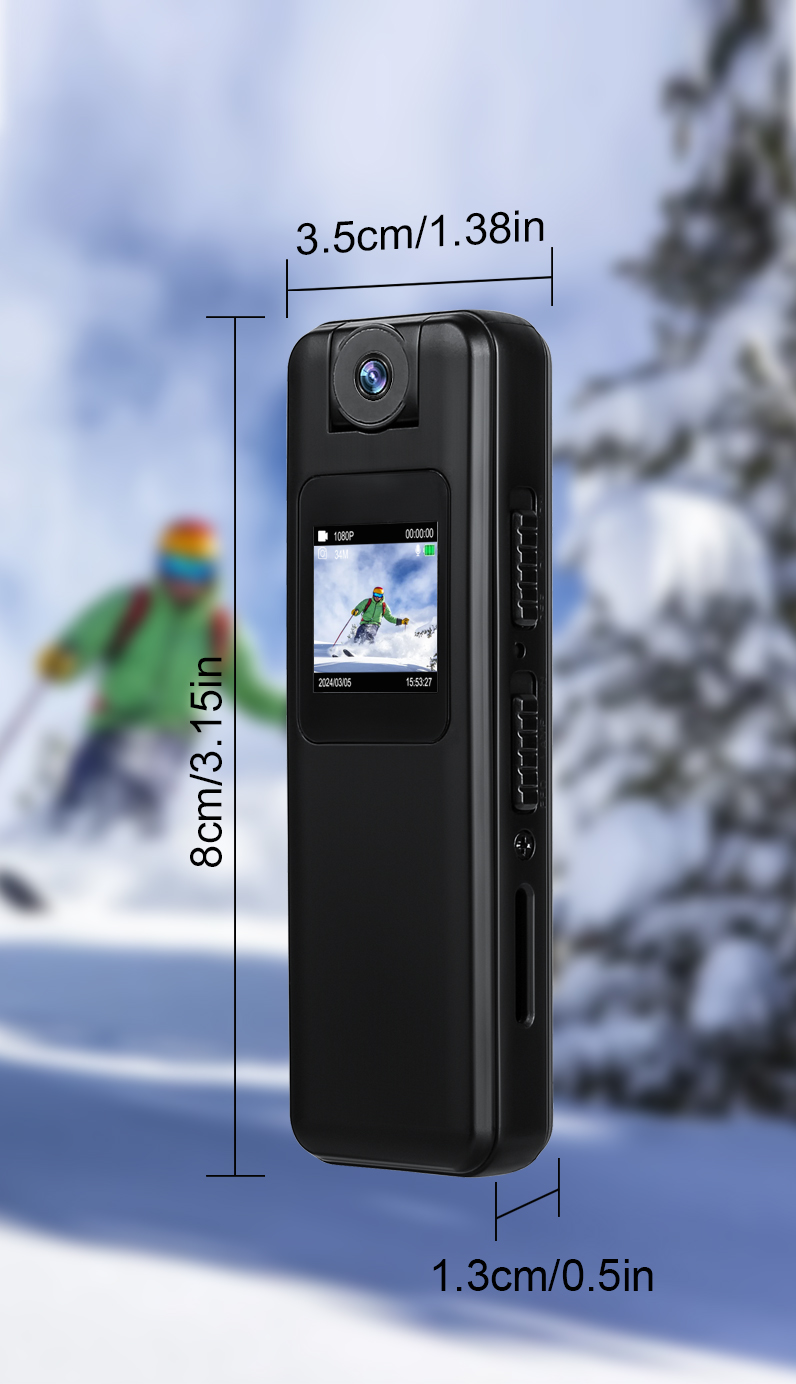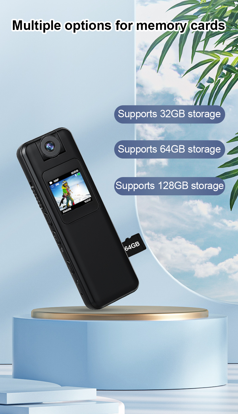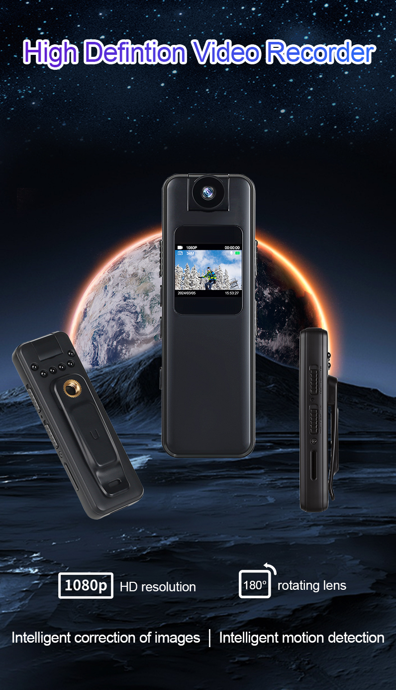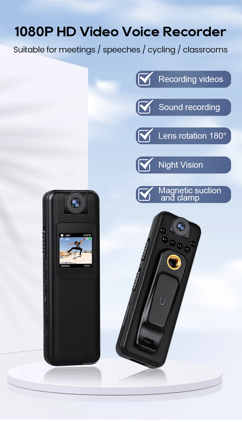 Features: 1. [Multi functional] Video shooting+recording+night vision+magnetic back clip+lens 180 degree rotation+screen display. 2. [High definition picture quality] High definition 1080P picture quality, clear shooting picture quality, built-in display screen, can view video playback on the device. 3. [180 degree rotating lens] The lens can rotate freely for shooting, supporting 180 degree rotation, and can be recorded from various angles. 4. [External Memory Card] Supports up to 32 GB of memory card, with large capacity memory that can store more video and audio files. 5. [Applicable scenarios] Outdoor sports/meeting records/teaching and learning/life records, etc.