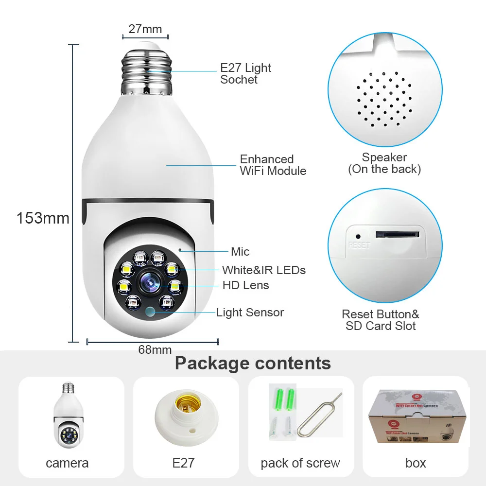 1 x CCTV Camera, 1 x User Manual, 1 x E27 Holder, 1x Screws Package